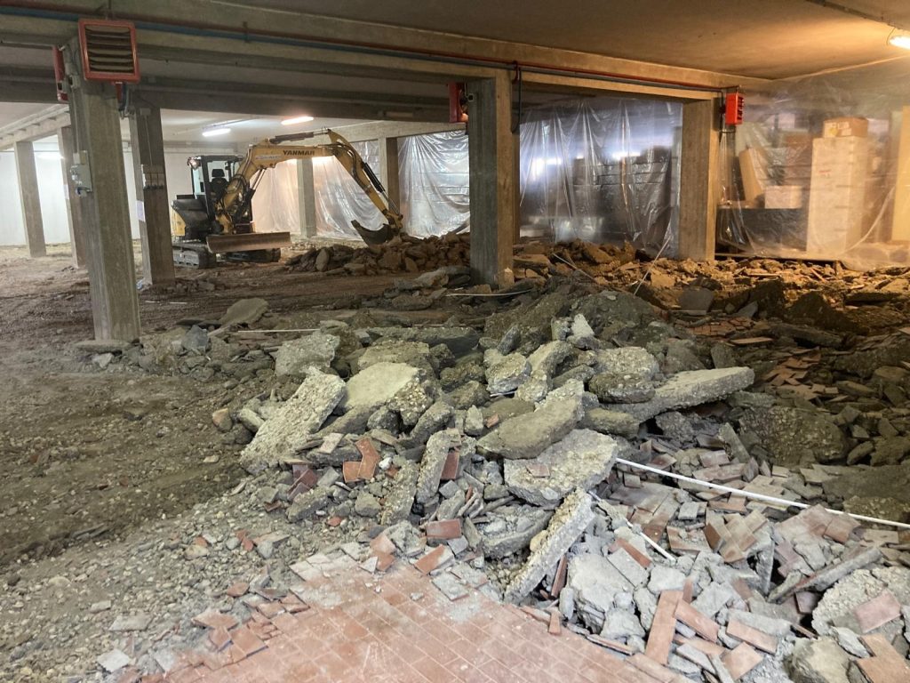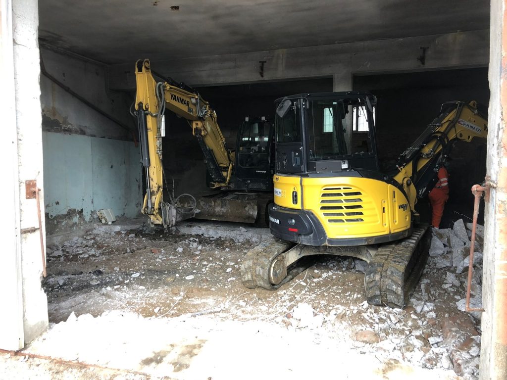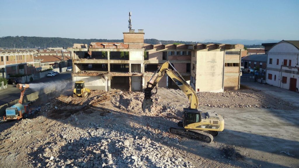 - Impiego di escavatori cingolati dotati di pinze idrauliche, frantumatori per calcestruzzo armato e martelloni oleodinamici.